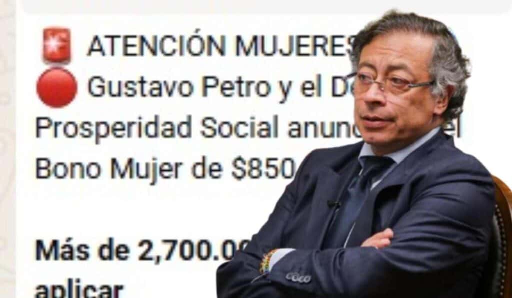 El contenido del mensaje menciona incluso al presidente Gustavo Petro y afirma que existirían “más de 2.700.000 bonos disponibles para aplicar”. Posteriormente, detalla supuestos requisitos para acceder al beneficio, señalando que estaría dirigido a mujeres mayores de 18 años. Al final del texto se adjunta un enlace que invita a las destinatarias a registrarse para reclamar el dinero.