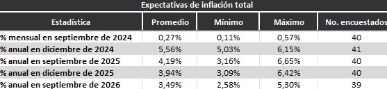 En la anterior medición se esperaba que terminaría el 2024 en 5,70 % y ahora se proyecta que cierre el año en niveles de 5,63 %, lo que muestra una importante reducción, tras conocerse que en agosto el IPC fue de 0 %.