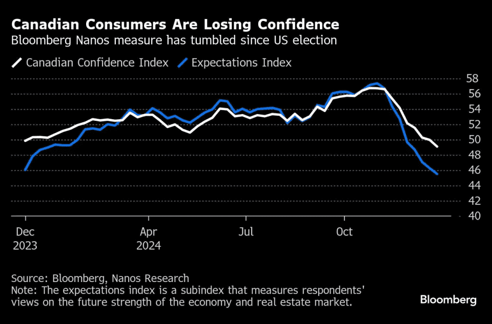 Bloomberg expuso que el indicador ha estado cayendo desde la elección de Trump el 5 de noviembre, y el pesimismo puede reflejar crecientes preocupaciones de que la nueva administración estadounidense imponga aranceles a los productos canadienses.